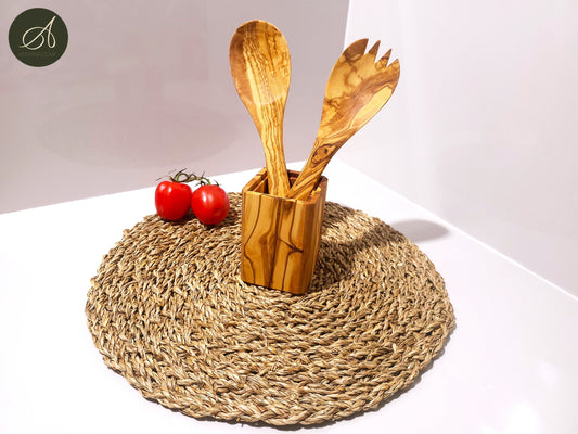 Wooden Set of cutlery and Utensil Holder, Olive Wood salad server with holder, Kitchen Utensils, spoon, fork, cutlery, handmade, gift